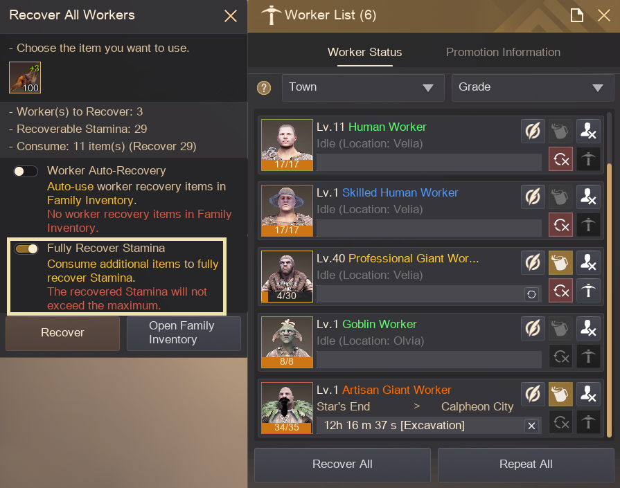 - This function uses additional recovery items to recover a worker's Stamina up to the maximum.
