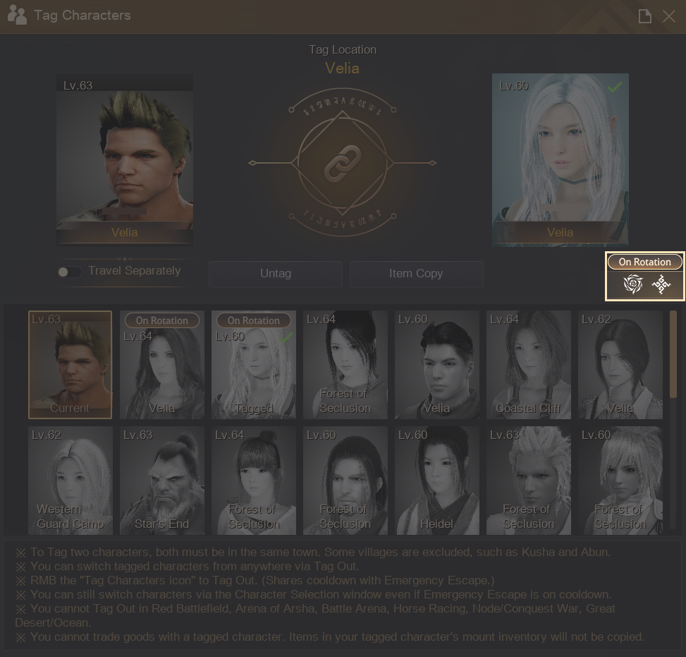 We have improved functions related to the Tag Character UI, as it was difficult to check the list and identify the character you are currently logged in with. Firstly, we have reorganized the character list to fit more on a single screen so that multiple characters can be checked simultaneously. Additionally, your current character will always appear at the top of the list, with a border around it to make it easier to identify.- Improved the UI to show more characters on a single screen instead of one line at a time.