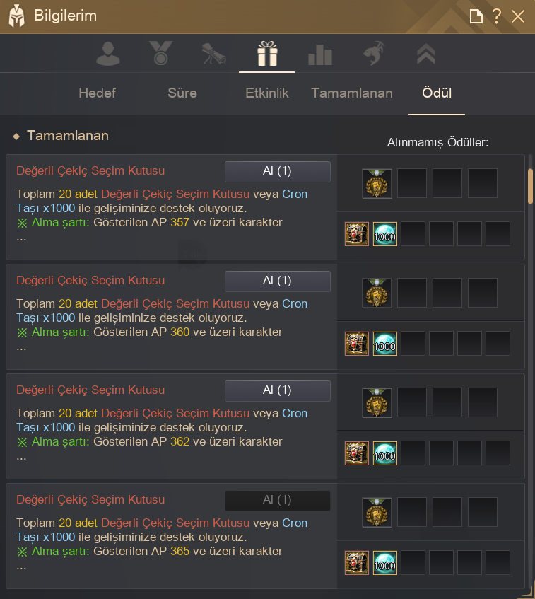 - Aşağıdaki görevleri tamamladığınızda, ilgili ünvanı Meydan Okuma (Y) kısmından alabilirsiniz.
