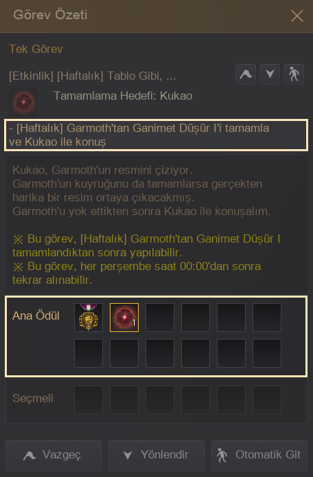 "[Haftalık] Garmoth'tan Ganimet Düşür I/II/III" görevini tamamladıktan sonra, Garmoth'un Yuvası Bağlantı Noktası Sorumlusu'nun yanında bulunan NPC Kukao'dan "[Etkinlik][Haftalık] Tablo Gibi, Garmoth I/II/III" görevini alın.