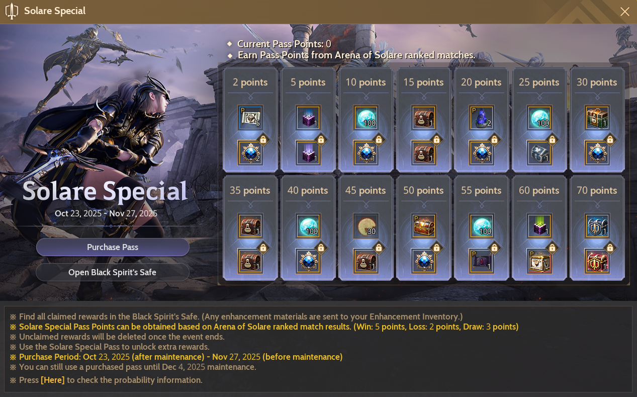- Claimed Solare Special rewards can be found in Black Spirit's Safe (B).