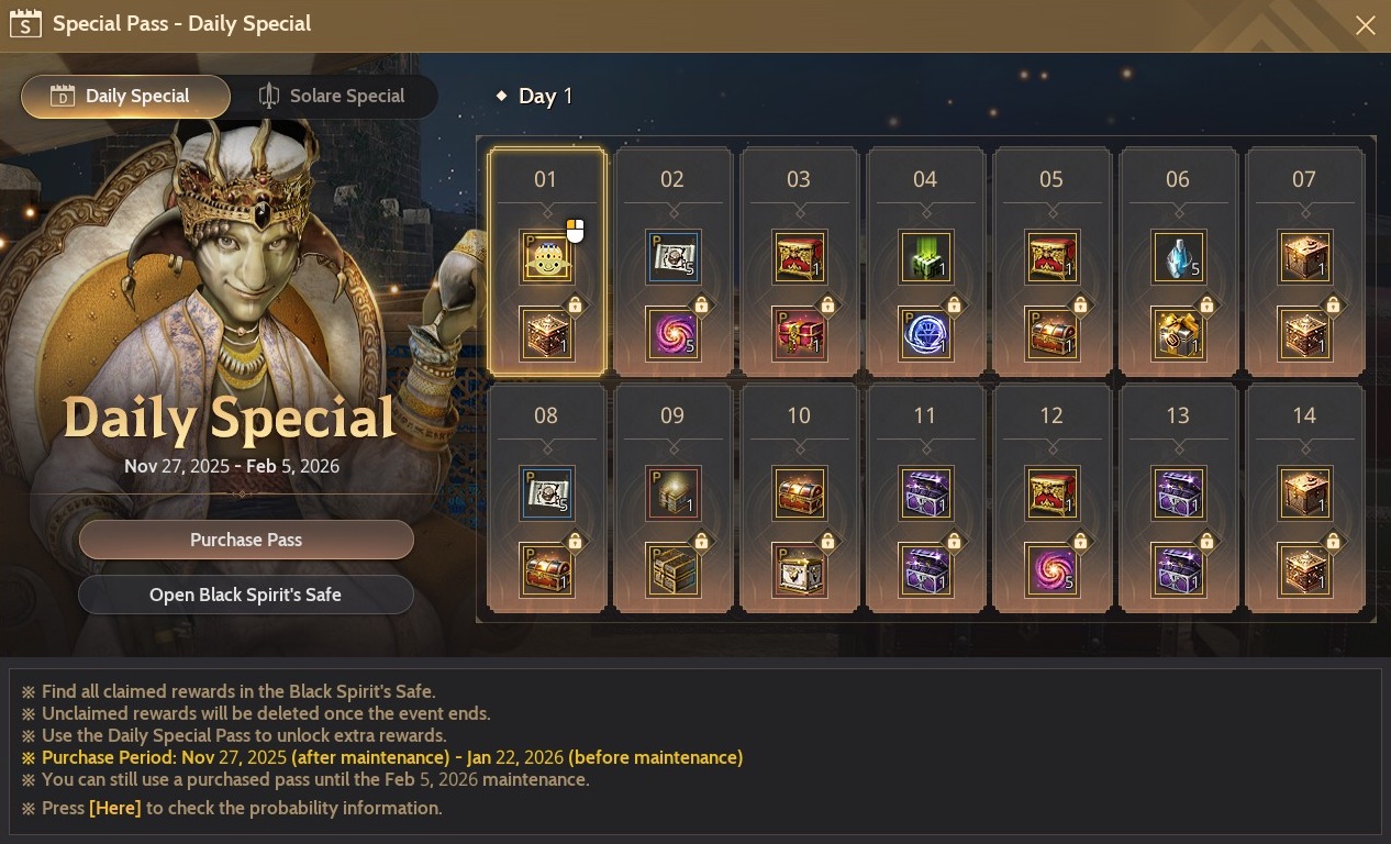 - Claimed Daily Special rewards can be found in Black Spirit's Safe (B).