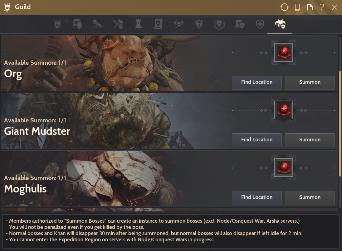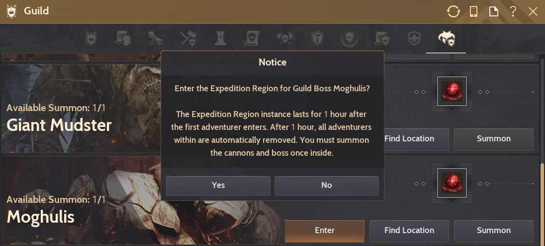 - When a Guild Master or an authorized guild member enters the designated summon location using the Guild Boss UI, a guild-exclusive Expedition Region will be created.