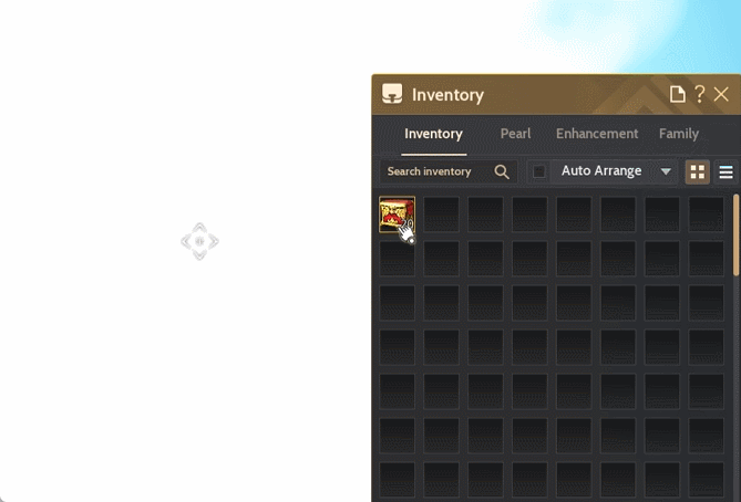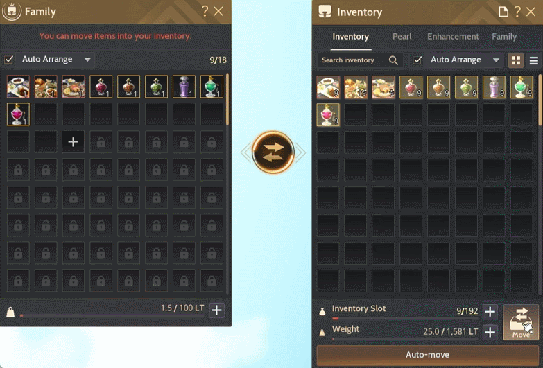 - Use this function to automatically move items from your normal inventory to your Family/Enhancement inventory if matching items already exist there.