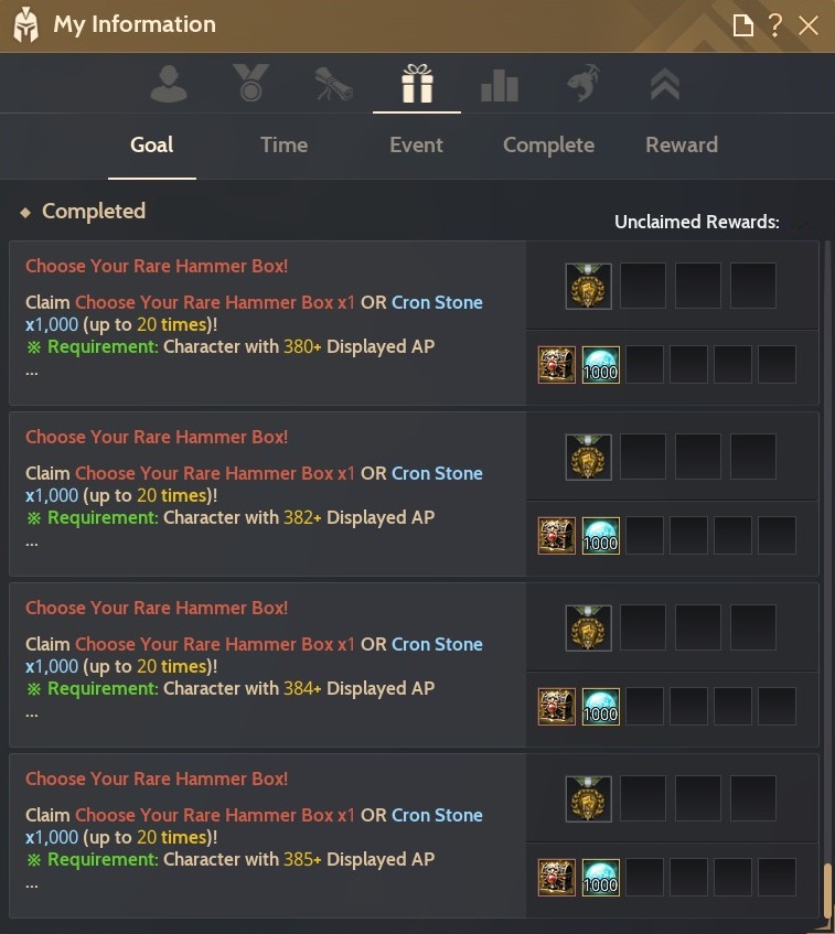 - Updated the "Choose Your Rare Hammer Box!" Challenges so they no longer display under Challenge (Y) - Reward unless their requirements are met. You can now find them under the "Goal" tab.