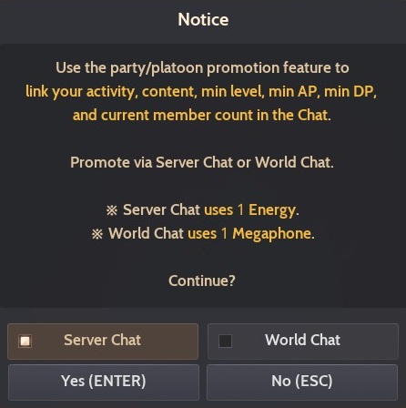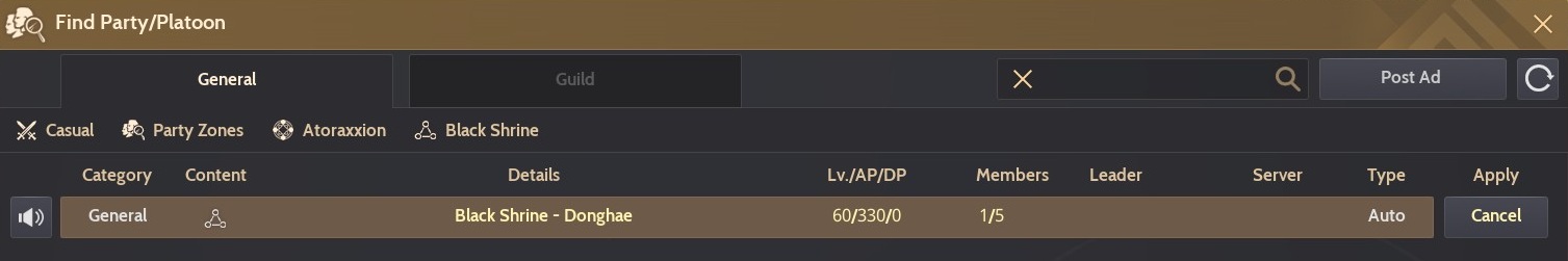 Use the Find Party/Platoon menu to apply for a Black Shrine party.