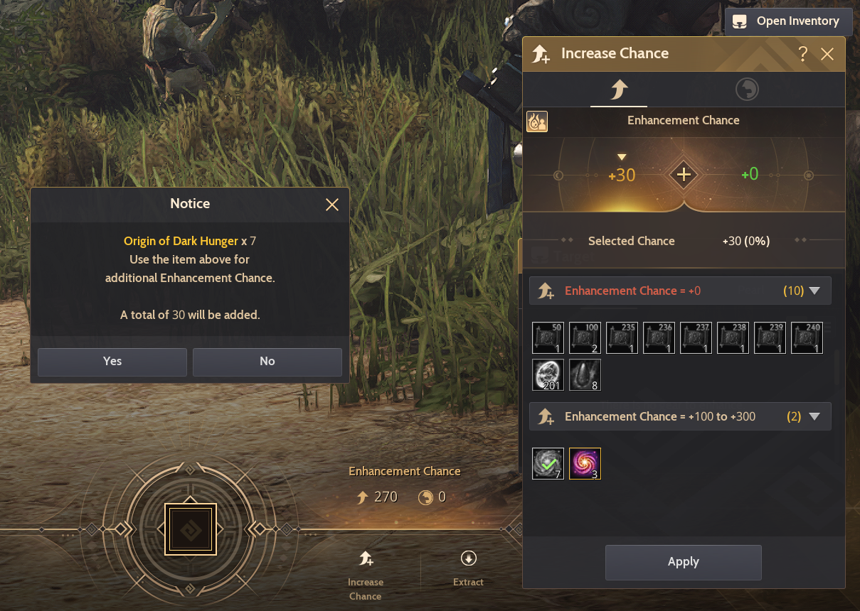 - Added a confirmation message when increasing Enhancement Chance with items such as Advice of Valks, Valks' Cry, and Origin of Hunger.