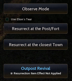 Another important element to Node and Conquest War is the definition of death .If you die during a Node War or Conquest War, you cannot resurrect immediately nor resurrect at the nearest node. You will have no choice but to select [Resurrect at Fort/Command Post] where you will then respawn at your fort. Also, if you use the ‘Escape’ function while a Node or Conquest War is in progress, you will be teleported to the nearest town.