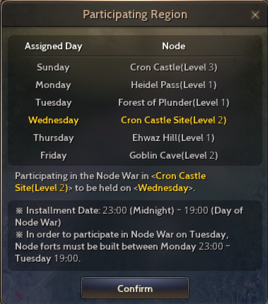 ※ There are two methods in selecting the combat zone in advance. First, choose a day of the week that a lot of guild members can gather. Each node has a set date that has node wars, so it is a good method to choose a day of the week that is good for your guild.