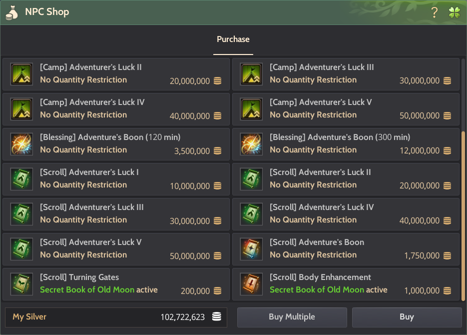 - [Scroll] Turning Gates and [Scroll] Body Enhancement can only be purchased while the Secret Book of Old Moon is active. (Traditional campsite buffs (non-scroll) requires either an active Secret Book of Old Moon or a Villa Invitation.)