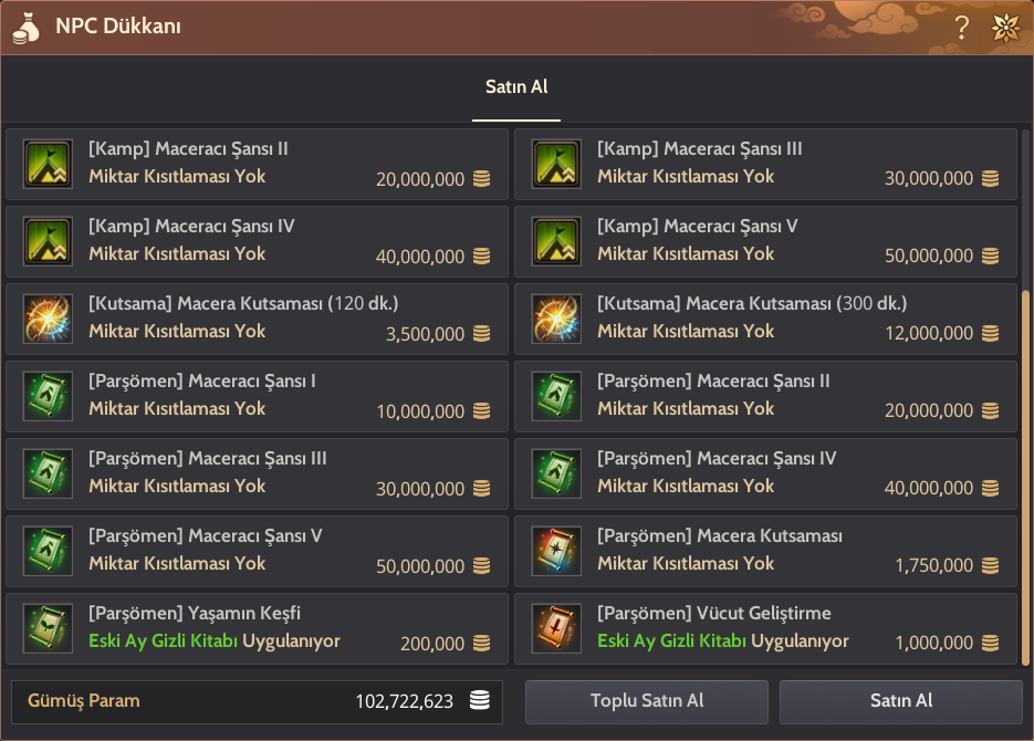 • [Parşömen] Yaşamın Keşfi ve [Parşömen] Vücut Geliştirme, Eski Ay Gizli Kitabı uygulanıoyrken satın alınabilir. (Parşömen olmayan kamp buffları ise, tıpkı eskiden olduğu gibi villa davetiyesine sahip olduğunuzda satın alınabilir)