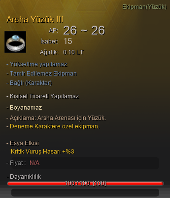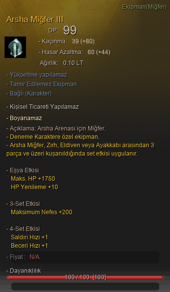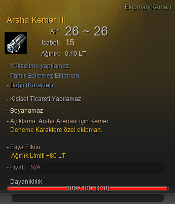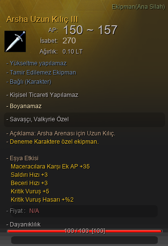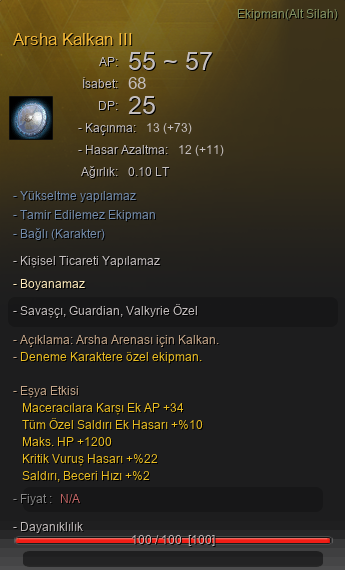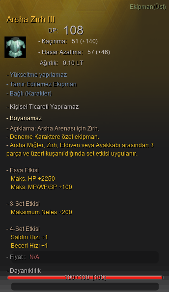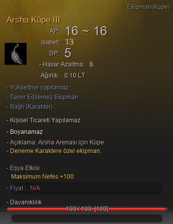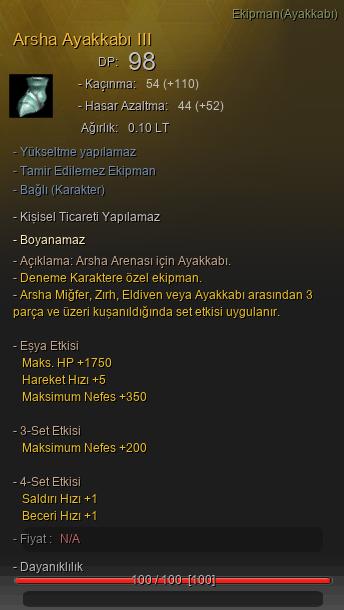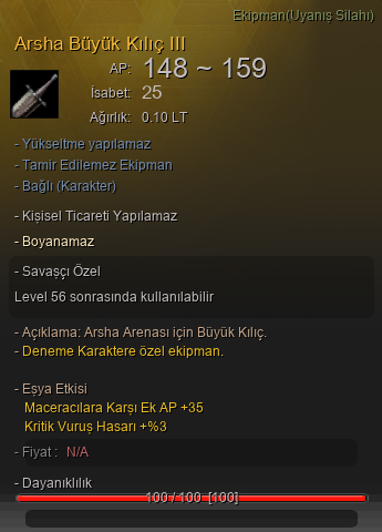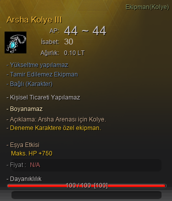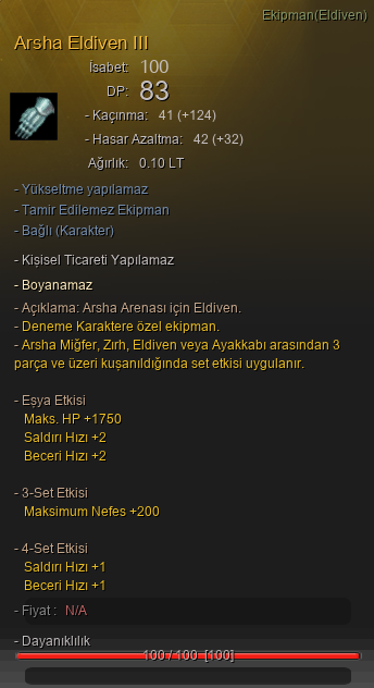 - Deneme Karakterle elde edilebilen Arsha Ekipmanı III çıktı.
