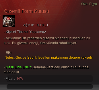 - Deneme Karakter oluşturulduğunda, Form potansiyelini maksimuma çıkaran bir eşya eklendi.