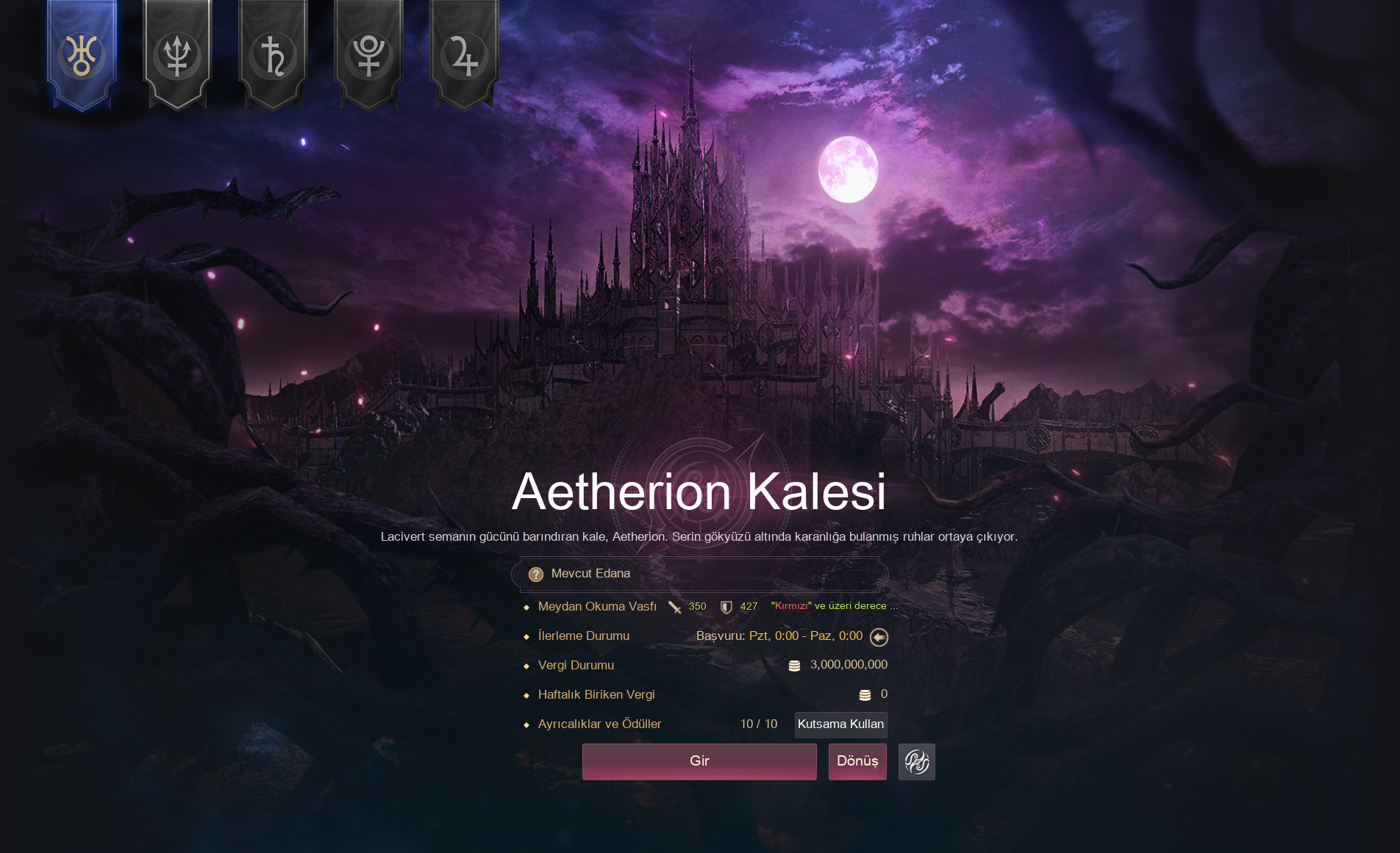 - Arayüzün sol üst kısmındaki her kalenin bayrağına tıklayarak kaleye özel bilgileri görebilirsiniz, başvurduğunuz Edana Tahtı bölgesi tik işaretiyle gösterilir.