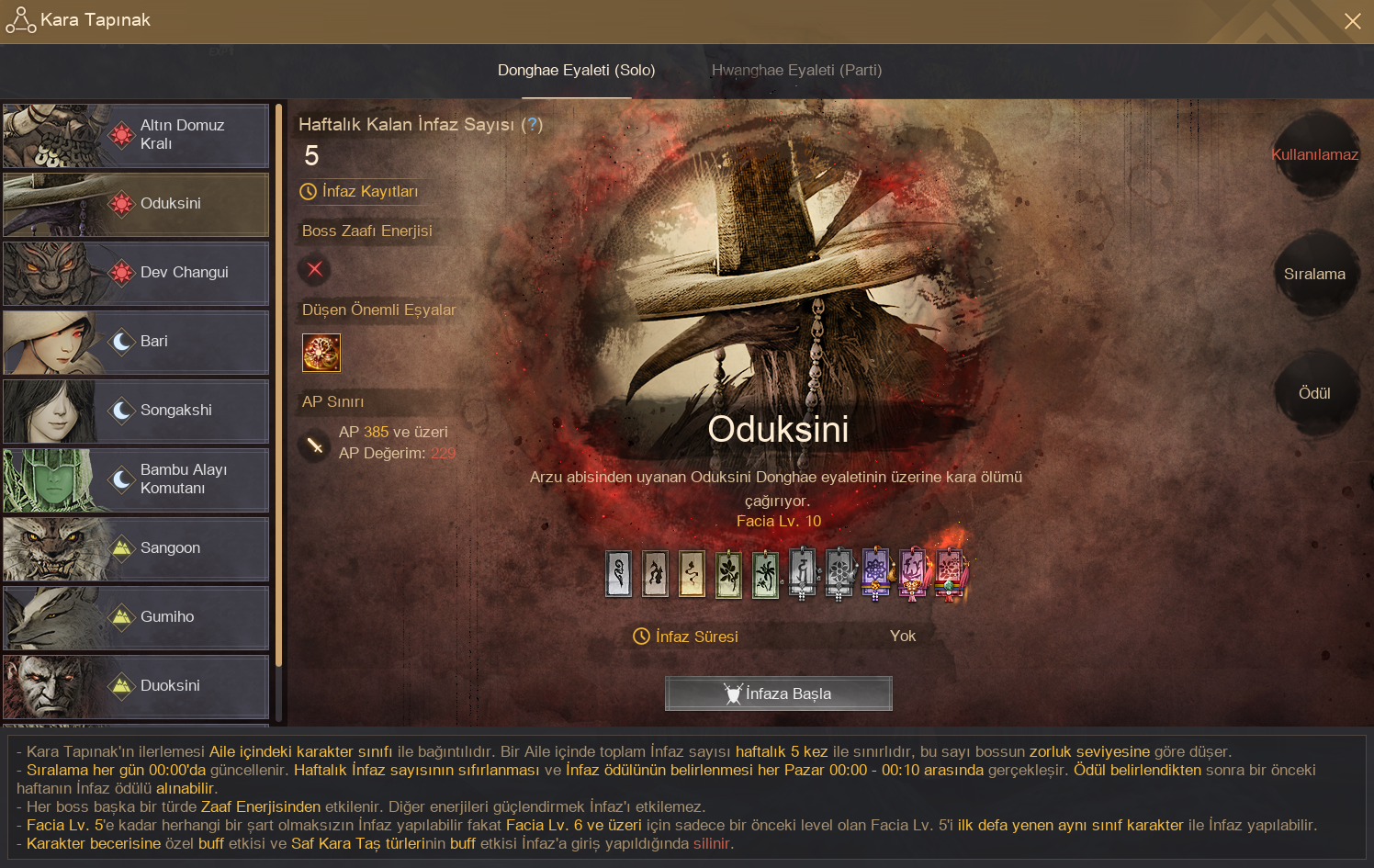 Oduksini, Donghae Eyaleti'nin son bossu olarak, Dev Changui'ye göre daha yüksek bir minimum AP şartına sahip olacak şekilde ayarlandı. Bununla birlikte, infazda başarılı olmanız halinde alacağınız ganimetler de kısmen güçlendirildi.