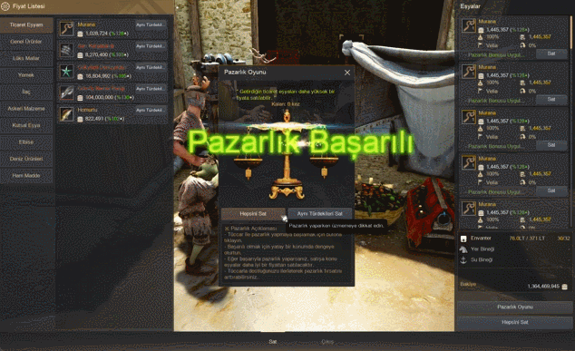 - Fiyat Listesi arayüzünde istediğiniz ticaret eşyası için "Aynı Türdekileri Sat" butonuna bastığınızda, sadece o eşyayı topluca satabilirsiniz.
