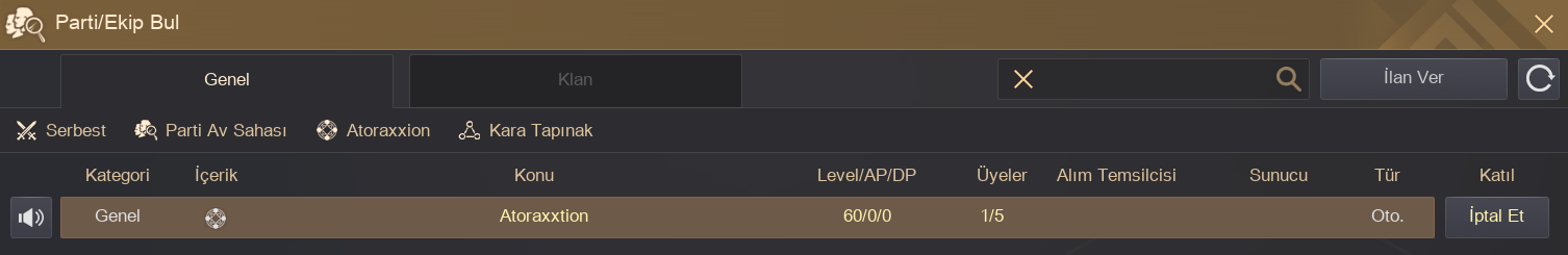 Parti/Ekip Bul arayüzünden Kara Tapınak partilerinin ilanlarına katılmayı deneyebilirsiniz.